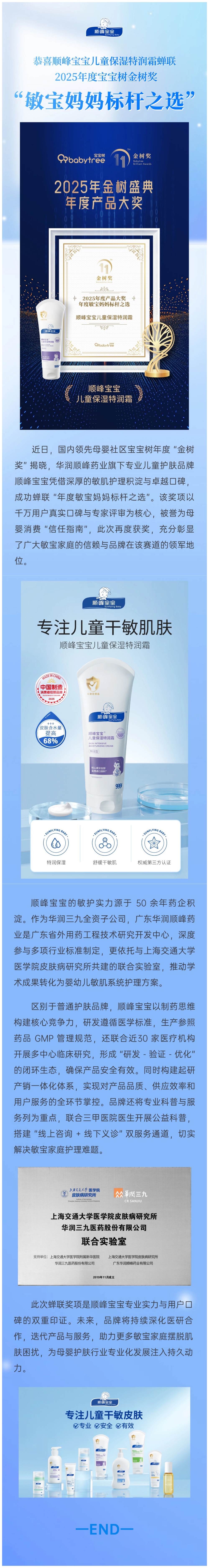 顺峰宝宝儿童保湿特润霜获评2025“粤妆甄品”,医研实力铸就婴童护肤标杆