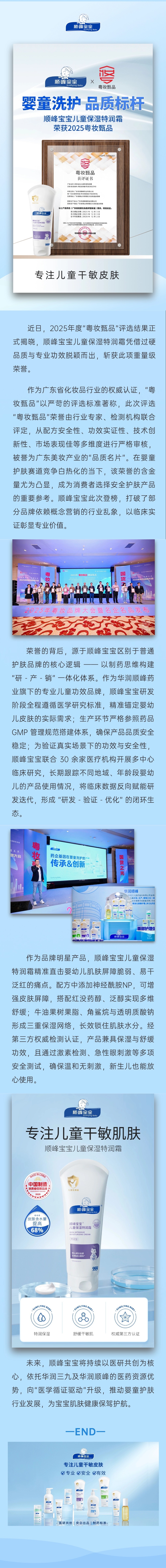 顺峰宝宝儿童保湿特润霜获评2025“粤妆甄品”,医研实力铸就婴童护肤标杆